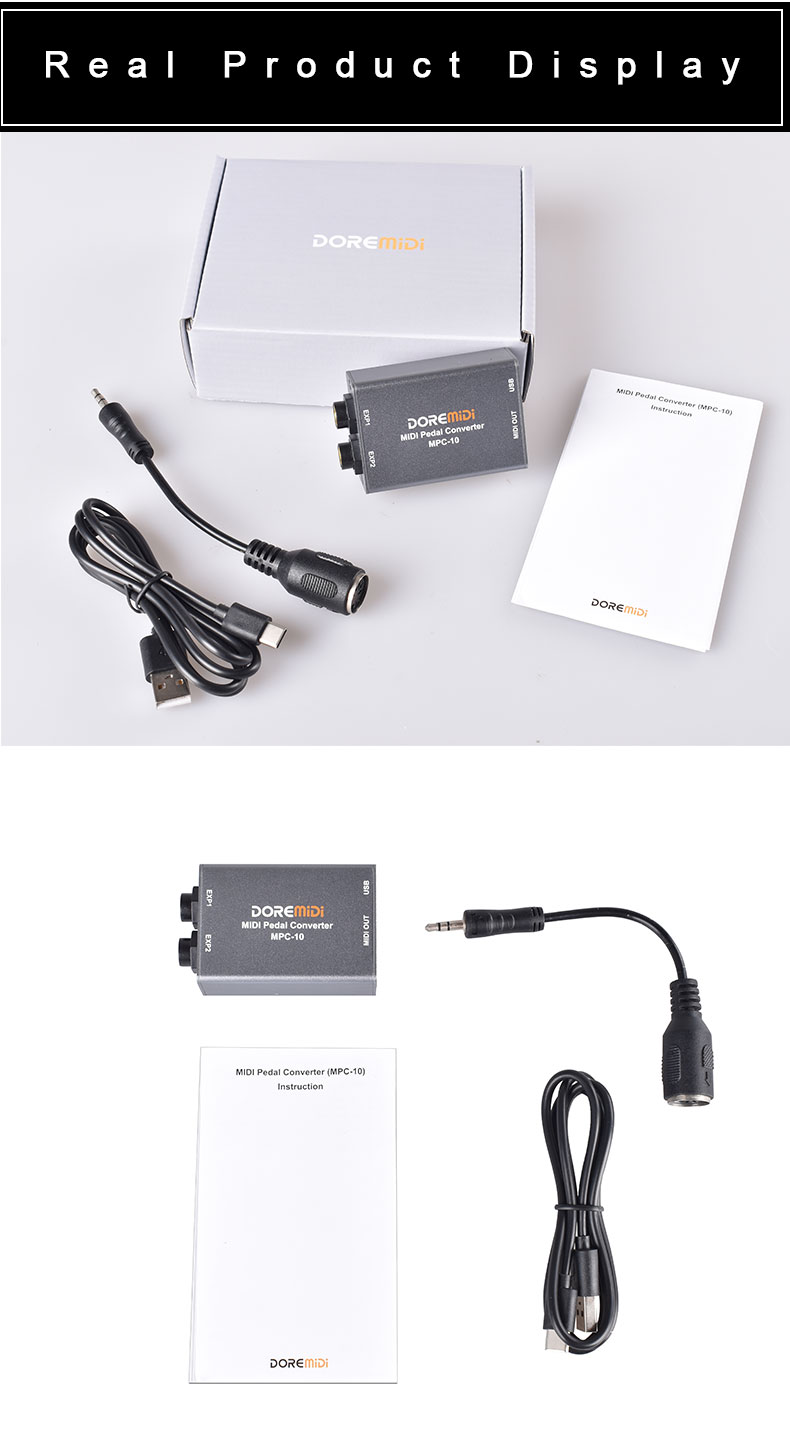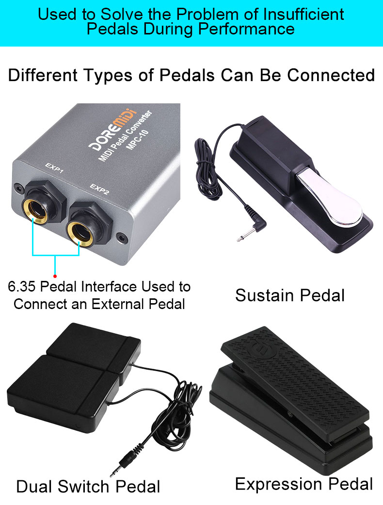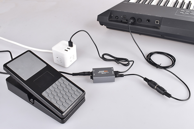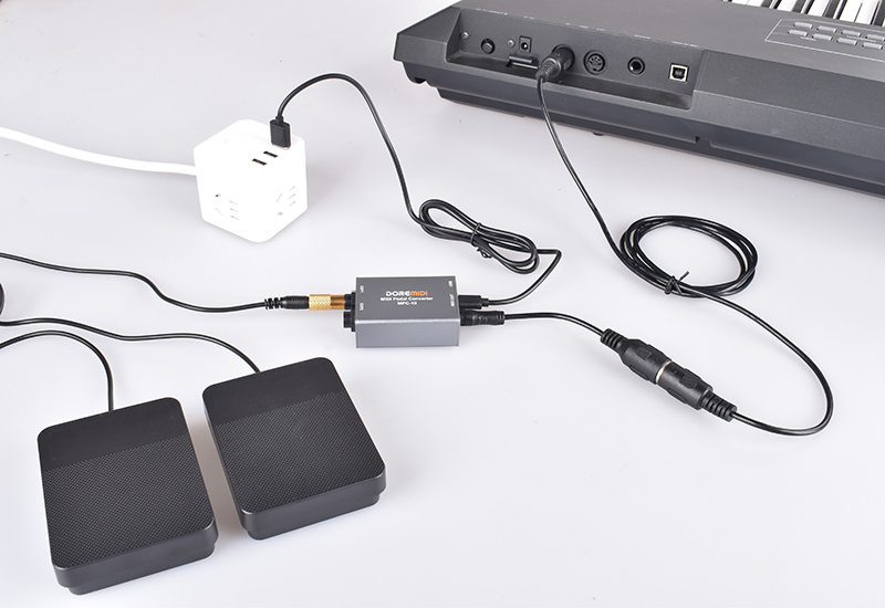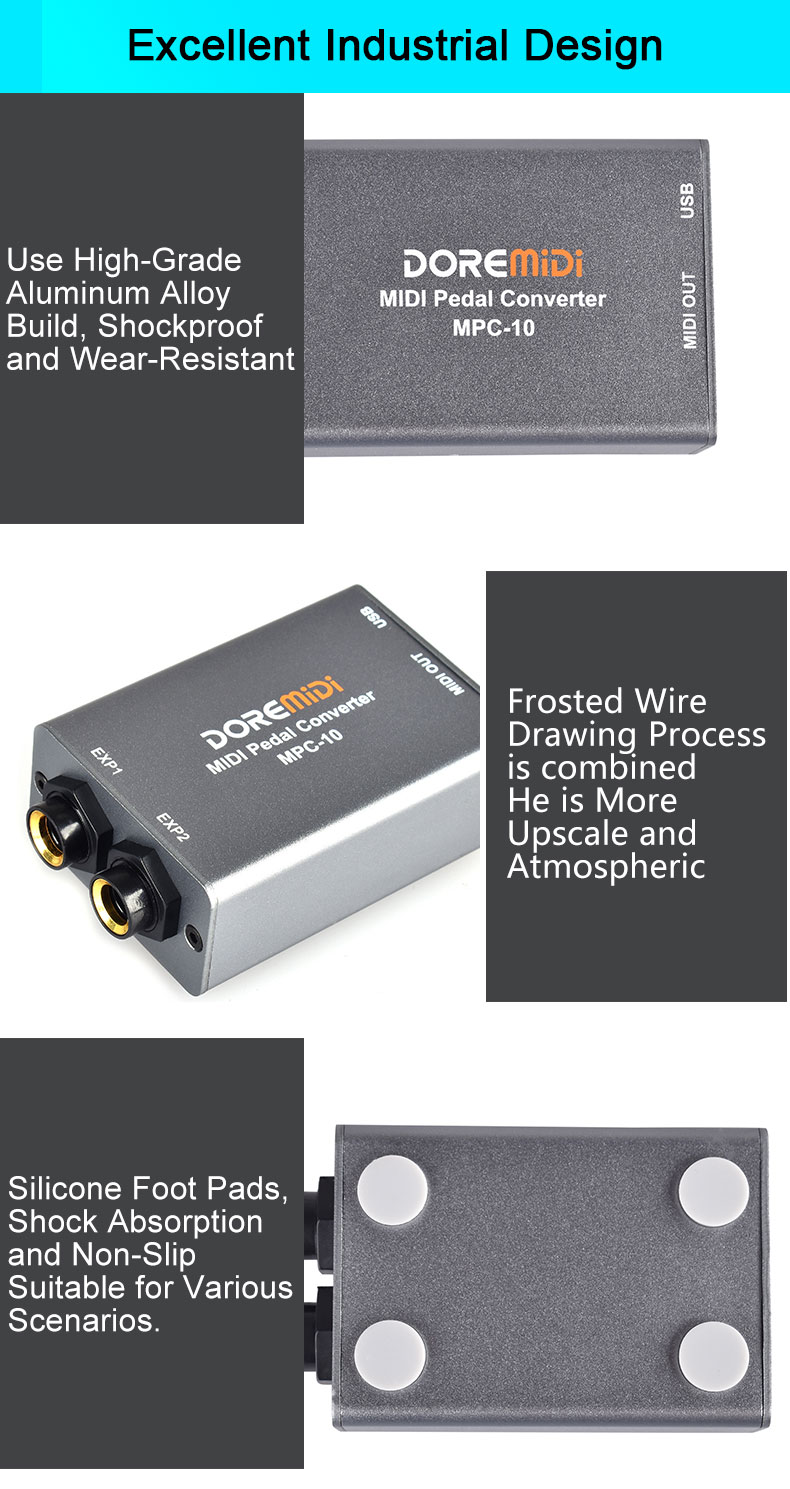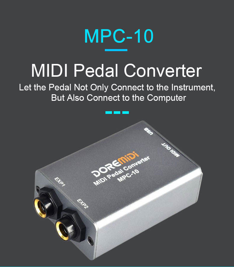 MIDI Pedal Converter (MPC-10) is a converter designed by DOREMiDi that can automatically detect multiple types of instrument pedals to solve the problem of insufficient number of pedals during performance. This product is compatible with positive polarity expression pedal, reverse polarity expression pedal,sustain pedal, and dual-switch pedal. It has MIDI DIN and USB MIDI outputs, and is suitable for use in a variety of performance scenarios.